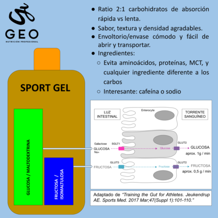 Los geles bien diseñados por lo general combinan varios tipos de hidratos de carbono: glucosa y/o maltodextrina y/o sacarosa con fructosa y/o isomaltulosa. Los primeros estabilizan la glucemia de forma rápida, los segundos aportan energía de forma mas paulatina y durante un periodo más largo de tiempo. Atendiendo a las investigaciones mas recientes los geles aportarán mas beneficios para el rendimiento del deportista a nivel de absorción intestinal de carbohidratos cuando combinen maltodextrina o glucosa frente a fructosa en un ratio 2:1, esto es 2 gramos de maltodextrina o glucosa por cada gramo de fructosa. Otros componentes interesantes para los geles es la cafeína y las sales minerales (especialmente el sodio). No obstante investigaciones mas recientes apuntan a que una combinación diferente de estos azúcares podría mejorar el confort gástrico aunque quedaría por demostrar que esto mejore el rendimiento deportivo. En este sentido estudios actuales también han observado que los deportistas son capaces de absorber cantidades superiores a los 90 g por hora de carbohidratos lo que parece mejorar algunos marcadores de daño/estrés pero también esta por corroborar que esto ayuda a mejorar el rendimiento deportivo. Por ello la combinación de carbohidratos mas conservadora, segura y mas estudiada y utilizada hasta ahora es el ratio 2:1 tal y como hemos descrito antes.