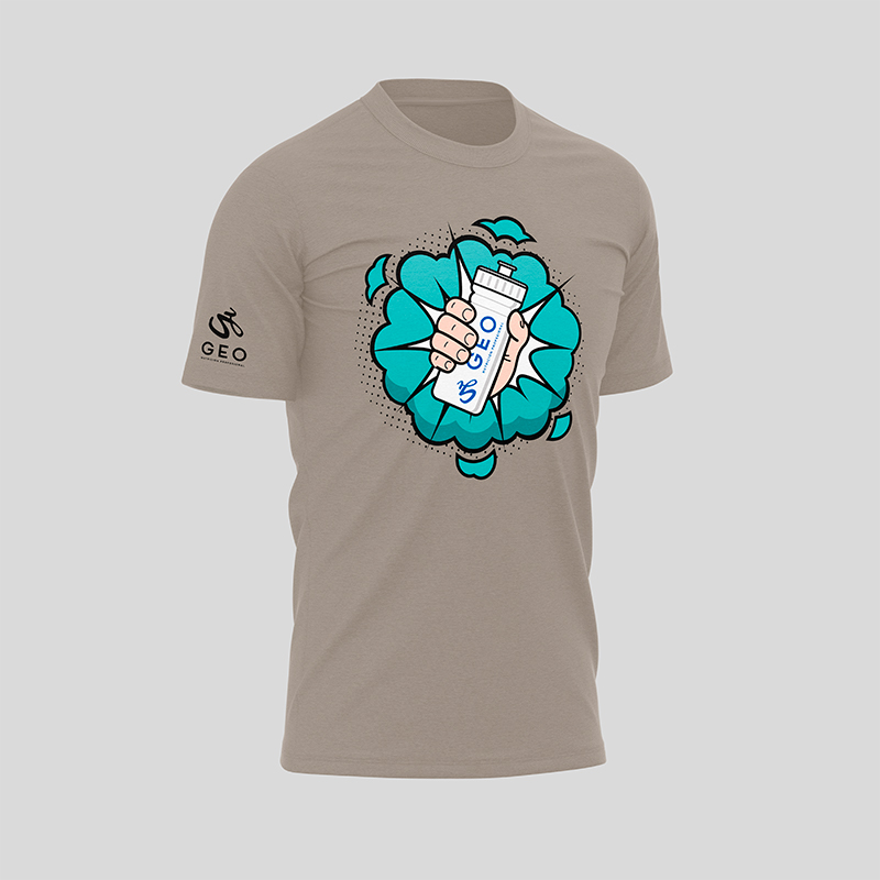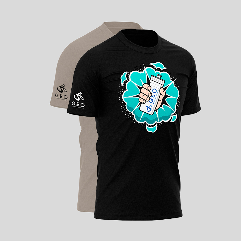 Camiseta GEO, nutrición profesional, con imagen de bidón en color gris o negro. Tallas S, M, L y XL.