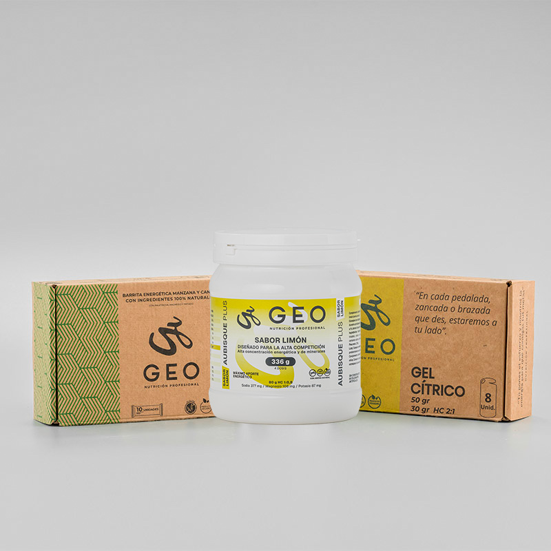 Pack Maigmo, que incluye 1 bote de aubisque plus, una caja de barritas GEO, de 10 unidades, a elegir sabor entre varias opciones, y una caja de gel GEO, de 8 unidades, a elegir sabor entre cola, cítrico o mixto entre los 2 sabores.