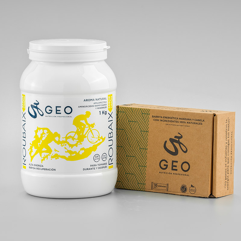 Pack Muro de Huy, que incluye un ROUBAIX de 1kg. a elegir entre sabor limón o fresa y una caja de barritas GEO, de 10 unidades, a elegir sabor entre chocolate, tropical, manzana-canela, fresa y arándanos, gominola fresa, gominola cítrica o gominola arándanos.