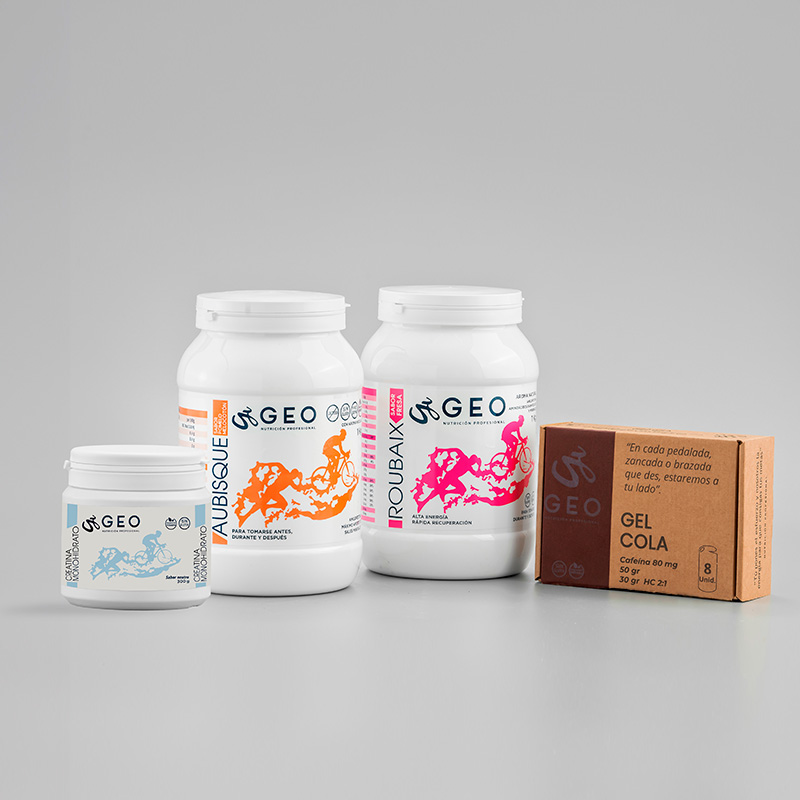 Pack Olano, que incluye ROUBAIX de 1kg. a elegir entre sabor limón o fresa, AUBISQUE de 1kg. a elegir entre sabor limón o pomelo melocotón, Creatina Monohidrato en formato de 300g y una caja de gel GEO, de 8 unidades, a elegir sabor entre cola, cítrico o mixto entre los 2 sabores.