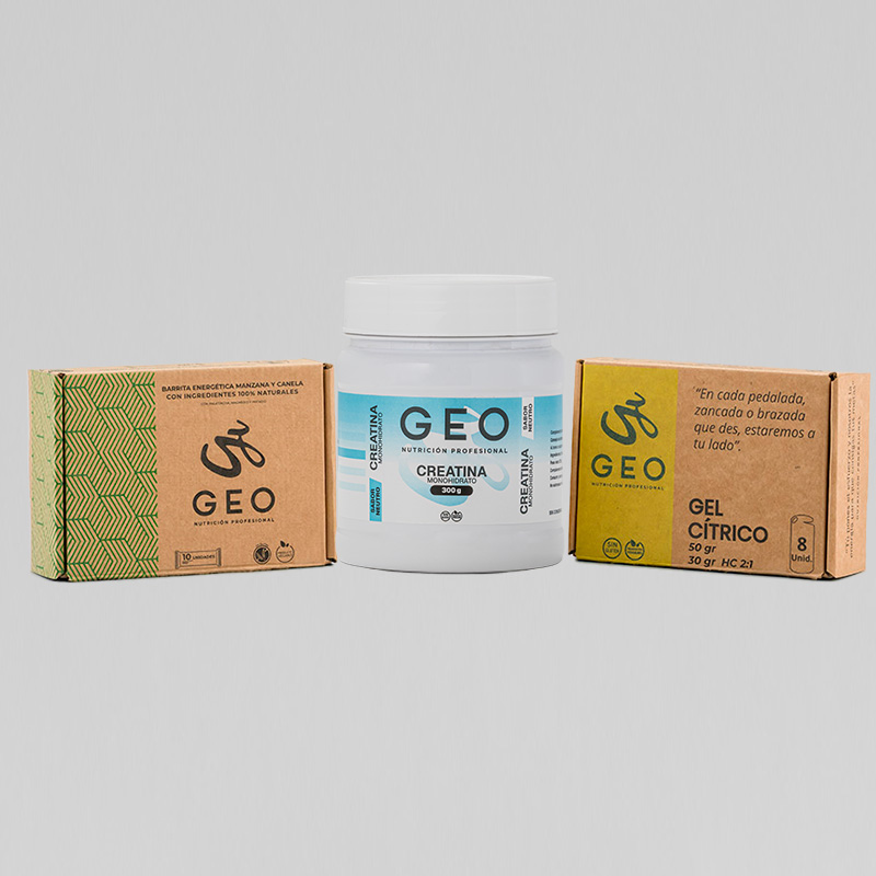 Pack Pantani, que incluye Creatina Monohidrato en formato de 300g, una caja de gel GEO, de 8 unidades, a elegir sabor entre cola, cítrico o mixto entre los 2 sabores y una caja de barritas GEO, de 10 unidades, a elegir sabor entre varias opciones.